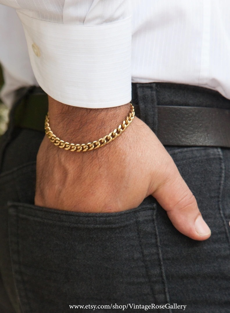Ανδρική αλυσίδα χεριού, πάχους 4 χιλιοστών και μήκους 22 εκατοστών. Κατασκευασμένη από ανοξείδωτο ατσάλι έτσι ώστε να μένει αμετάβλητη στο χρόνο.Επιμετάλλωση κίτρινου χρυσού