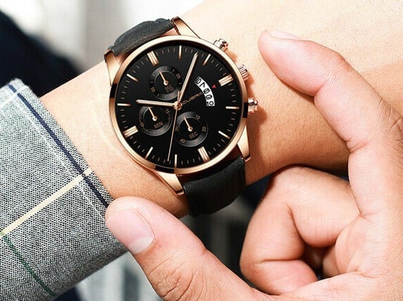 Ανδρικό, αναλογικό ρολόι GENEVA, με ιδιαίτερο βελουτέ λουράκι και μαύρο καντράν με rose gold λεπτομέριες. Η κάσα του είναι rose gold χρώματος από ανοξείδωτο ατσάλι. Διαθέτει ένδειξη ημερομηνίας. Το λουρί έχει μήκος 25 εκατοστά και η διάμετρος του καντράν είναι 4,5 εκατοστά.