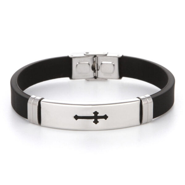 Μοντέρνο ανδρικό βραχιόλι, με μοτίφ στο αιώνιο σύμβολο του σταυρού.Kατασκευασμένο από σιλικόνη και ανοξείδωτο ατσάλι έτσι ώστε να μένει αμετάβλητο στο χρόνο. Το βραχιόλι έχει μήκος 21 εκατοστά.
