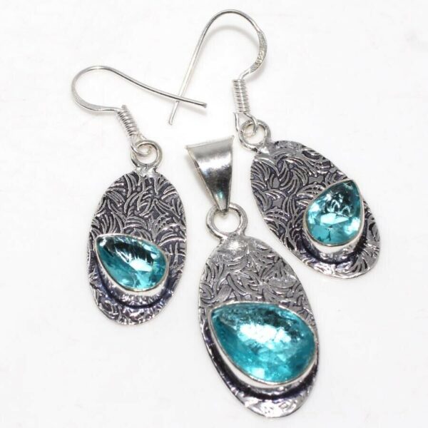 Χειροποίητο σετ που αποτελείται από μενταγιόν μαζί με την αλυσίδα του και σκουλαρίκια. Κατασκευασμένο από ασήμι διακοσμημένο με λαμπερές υπέροχες πέτρες blue topaz σε κοπή Pear. Τα σκουλαρίκια έχουν μήκος 3,8 εκατοστά και το μενταγιόν 4 εκατοστά.