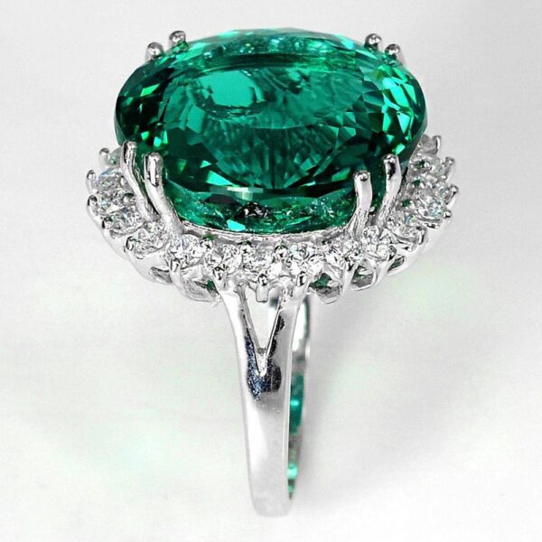 Δαχτυλίδι κατασκευασμένο από ασήμι 925 διακοσμημένο με έναν πράσινο, Τσαβορίτη χαλαζία σε κοπή round και μικρότερα λευκά ζαφείρια, Main Gemstone: (Lab created) περιμετρικά στο στεφάνι του. Το δαχτυλίδι είναι διαθέσιμο σε όλα τα νούμερα. Κωδικός ΤΟ334 Τιμή 32 ευρώ.