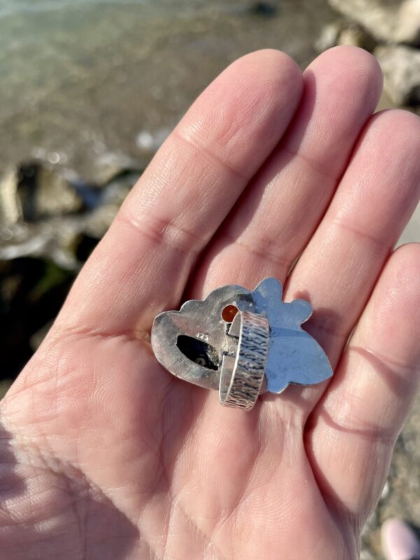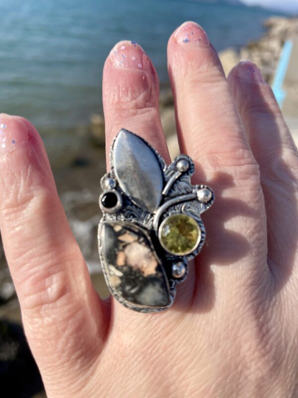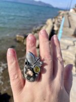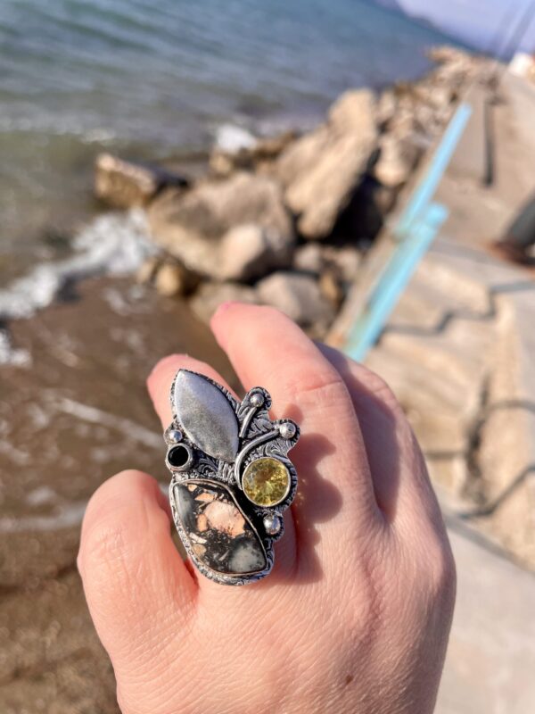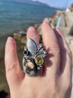 Σφυρήλατο, Χειροποίητο δαχτυλίδι, κατασκευασμένο από μασίφ ασήμι 925. Διακοσμημένο με ορυκτή πέτρα Maligano Jasper (Ιασπις). Στην περαιτέρω διακόσμηση του διαθέτει ακόμη 2 ορυκτές πέτρες σε κοπή round ένα Citrine (Κιτρίνης) και ένα μικρότερο Μοργκανίτη (Morganite) σε χρώμα βαθύ κόκκινο. Ένα πραγματικά μεγάλο και εντυπωσιακό δαχτυλίδι που θα απογειώσει την εμφάνισή σας!