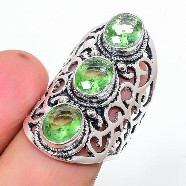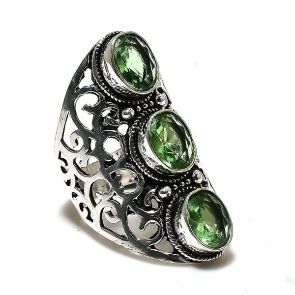 Xειροποίητο δαχτυλίδι, κατασκευασμένο από μασίφ ασήμι 925 από τη συλλογή Symbols. Διακοσμημένο με πέτρες Τσαβορίτη από τη συλλογή Symbols. Ειδικά κατασκευασμένο να αγκαλιάζει και να εφαρμόζει πάνω στο δάχτυλο σαν γάντι. Το καστόνι του διακοσμείται με χειροποίητο, περίτεχνο σκάλισμα, με τις τρεις πράσινες πέτρες τσαβορίτη, ελαφρά υψωμένες στο κέντρο του . Ένα πραγματικά μεγάλο και εντυπωσιακό δαχτυλίδι μήκους 4 εκατοστών, που θα απογειώσει την εμφάνισή σας!