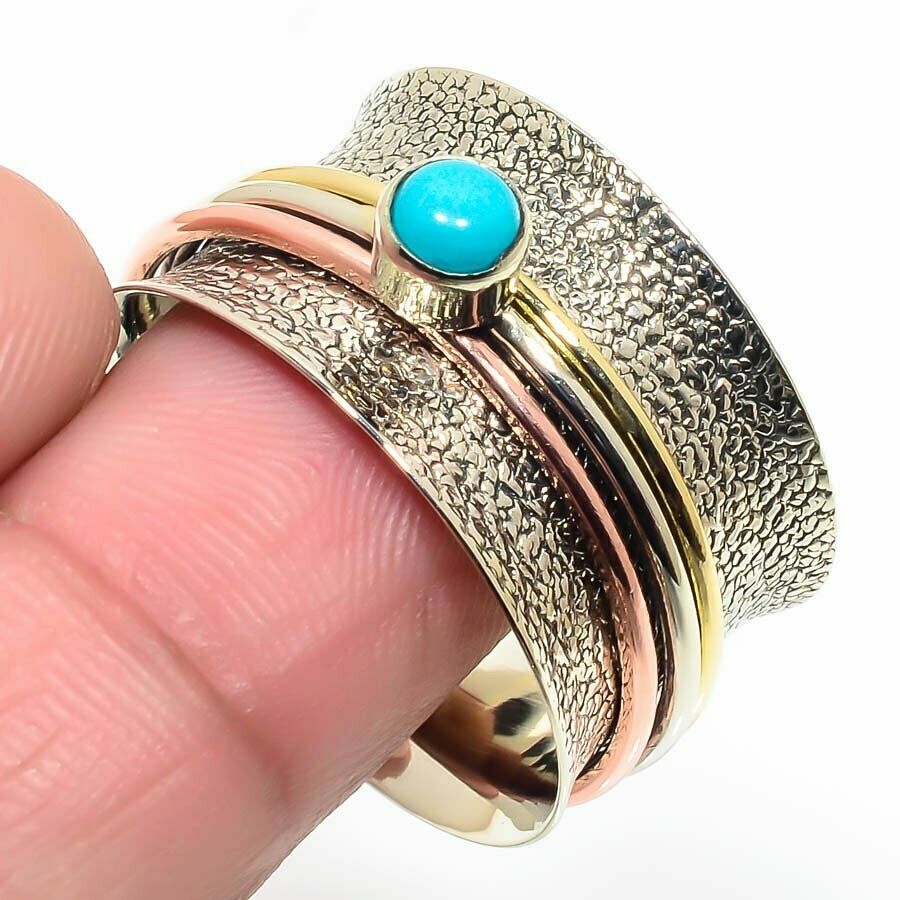 Δαχτυλίδι Spinner Rings, χειροποίητο, κατασκευασμένο από ασήμι 925, διακοσμημένο με φυσικό, ορυκτό, ημιπολύτιμο λίθο τυρκουάζ. Mε επιμετάλλωση στα τρία χρώματα του χρυσού, κίτρινο ροζ και λευκό.