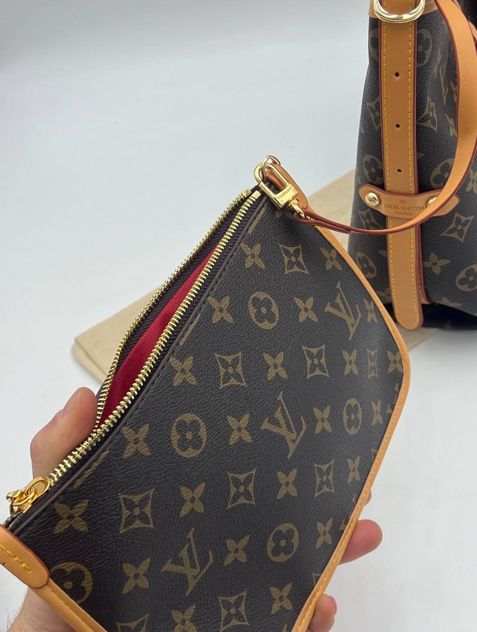 Συνδυάζοντας τη γοητεία με τη φιλική προς το σώμα σχεδίαση, η τσάντα CarryAll PM σε καμβά Monogram με επένδυση είναι μια τσάντα πόλης που πηγαίνει παντού. Η μεγάλη χωρητικότητα αποθήκευσης και το έξυπνα σχεδιασμένο εσωτερικό, με δύο μεγάλες εσωτερικές τσέπες, το καθιστούν πρακτικό. Μια αποσπώμενη θήκη με φερμουάρ, επίσης σε καμβά Monogram, στερεώνεται στην τσάντα με δερμάτινο λουράκι.
