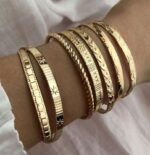 Γυναικείο μοντέρνο σετ που αποτελείται από 7 βραχιόλια! Χρυσές γυναικείες χειροπέδες από ορείχαλκο οι οποίες αυξομειώνονται και εφαρμόζουν ιδανικά σε κάθε γυναικείο καρπό με διπλή επιμετάλλωση κίτρινου χρυσού. Τα 7 βραχιόλια είναι open size έτσι ώστε να προσαρμόζονται σε όλα τα μεγέθη καρπών. Tο σετ των 7 βραχιολιών έρχεται σε σας σε πολυτελή μπαμπού μπιζουτιέρα δώρου