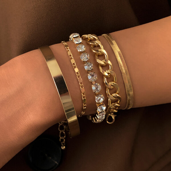 Ένα εντυπωσιακό σετ σύνολο 5 κομψών βραχιολιών σίγουρα θα φωτίσει οποιονδήποτε από τους συνδυασμούς μόδας. Τα βραχιόλια είναι κατασκευασμένα από χρυσό ατσάλι με διπλή επιμετάλλωση χρυσού. Τα βραχιόλια διαθέτουν και αλυσιδάκι προέκτασης.