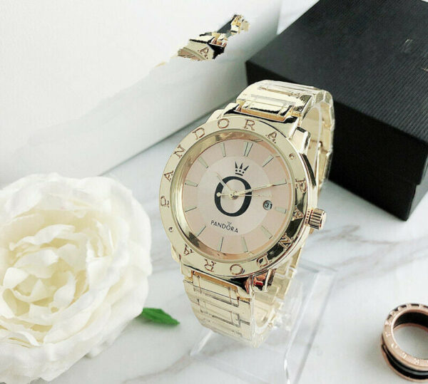 Γυναικείο ρολόι πολυτελείας PANDORA, αναλογικό, πολύ μοντέρνο, σε gold χρώμα σε μπρασελέ και καντράν από ανοξείδωτο ατσάλι υψηλής αντοχής και ποιότητας για καθημερινή χρήση και με ενισχυμένο αντιθαμβωτικό τζάμι στο καντράν του! Αντιαλλεργικό, σύμφωνα με τις απαιτήσεις της Ευρωπαϊκής Ένωσης! Διαθέτει και ένδειξη ημερομηνίας! Εσωτερικά το καντράν του έχει δίχρωμη απόχρωση.