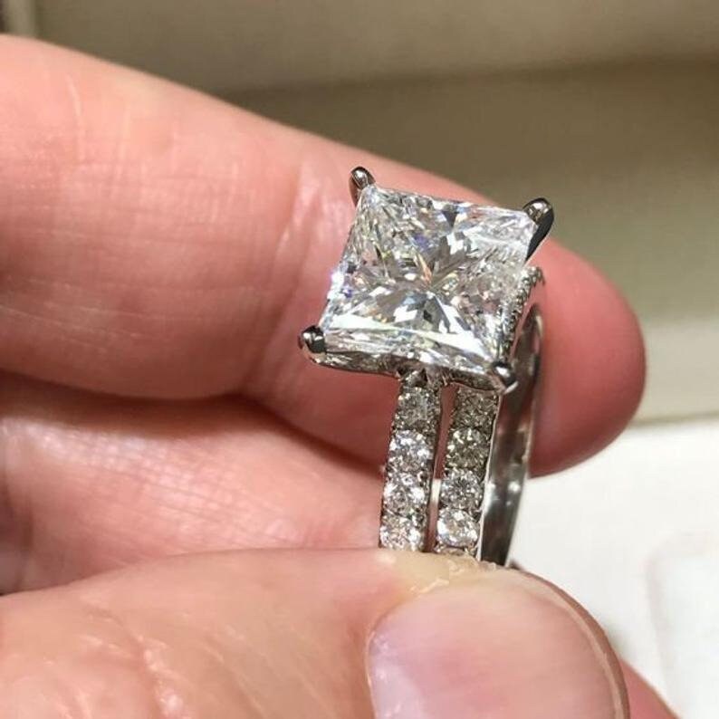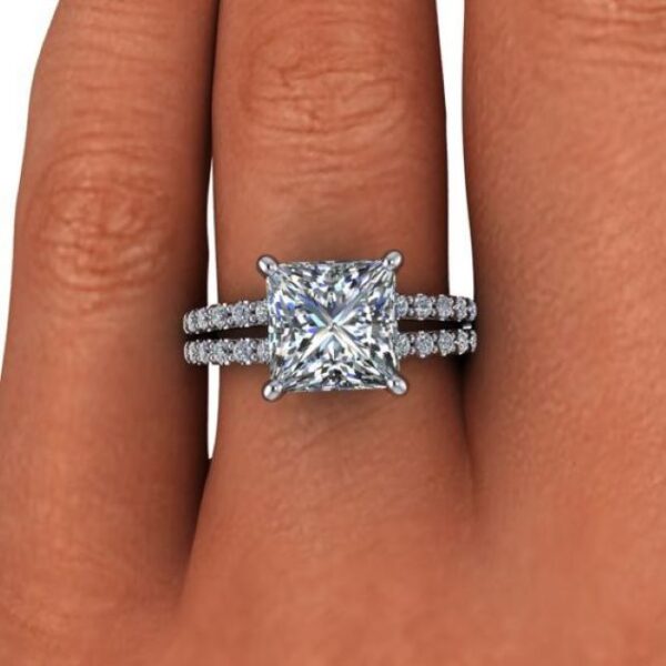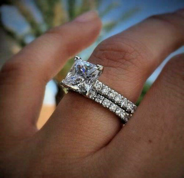 Aσημένιο 925 ΣΕΤ 2 δαχτυλιδιών που αποτελείται από βέρα (δαχτυλίδι σείρε), με λευκά ζαφείρια (lab-created) σε κοπή round. Μονόπετρο δαχτυλίδι διακοσμημένο με λευκό ζαφείρι 9mm (lab-created) σε κοπή Cushion και μικρότερα λευκά ζαφείρια σε κοπή round.Βάρος Πετρών: 0.59ct .Βάρος 4.4grams