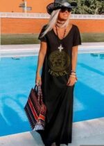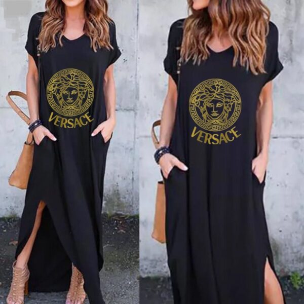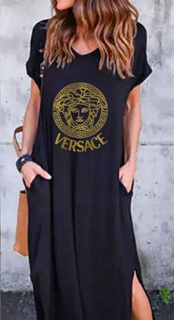 Αέρινο καλοκαιρινό φόρεμα Versace logo για να είστε πάντα στη μόδα! Είναι κατασκευασμένο από 80% βαμβάκι και 20% βισκόζη και διαθέτει πλαϊνές τσέπες. Διαθέσιμο από S έως 3XL! Γιατί μια γυναίκα με ένα μακρύ, αέρινο φόρεμα, δείχνει πως δεν έχει κάνει ιδιαίτερη προσπάθεια για να εντυπωσιάσει, το σώμα “κρύβεται” κάτω από το πλούσιο ύφασμα και η φαντασία… οργιάζει.