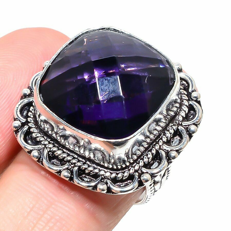 Δαχτυλίδι χειροποίητο, ινδικό. Kατασκευασμένο από μασίφ ασήμι 925 και διακοσμημένο με αμέθυστο σε κοπή Cushion (Lab creation). Περιστοιχίζεται περιμετρικά από χειροποίητη δαντέλα.