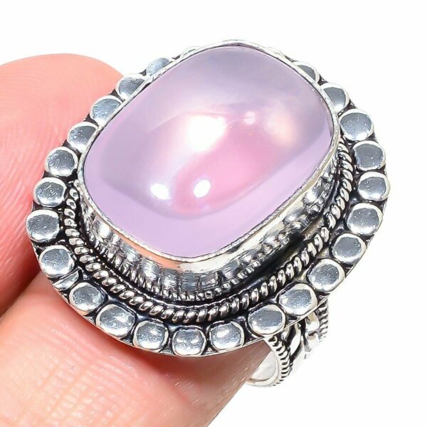 Δαχτυλίδι χειροποίητο, ινδικό. Kατασκευασμένο από μασίφ ασήμι 925 και διακοσμημένο με ροζ χαλκηδόνιο λίθο (Lab creation) σε κοπή round.Περιστοιχίζεται περιμετρικά από χειροποίητη δαντέλα.Tο νούμερο του δαχτυλιδιού είναι 9 ή αλλιώς 59.