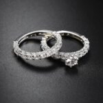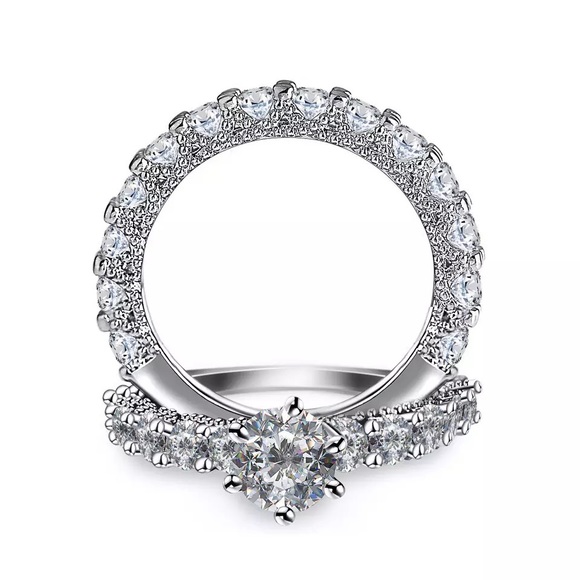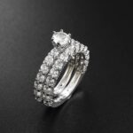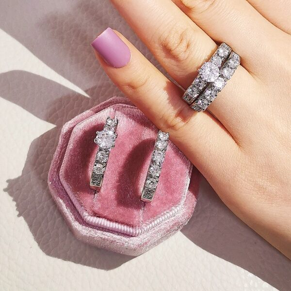 Επάργυρο σετ δαχτυλιδιών αποτελούμενο από μία βέρα σειρέ και ένα μονόπετρο σειρέ, διακοσμημένα με λευκά ζαφείρια (Lab creation) round cut και το κορυφαίο