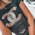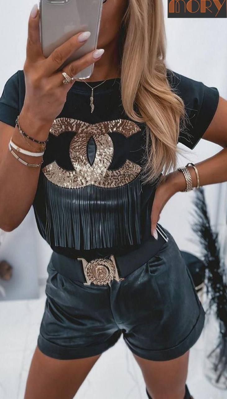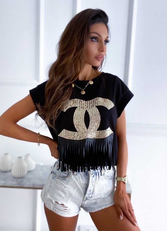 Μοντέρνο καλοκαιρινό μαύρο t-shirt με κρόσια και παγιέτες. Υφασμα 100% βαμβακερό.