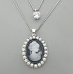 Ένα πραγματικό αριστούργημα το μενταγιόν που σας προτείνουμε!! Ένα διπλό κολιέ στο πρώτο μάκρος του 52 εκατοστά, είναι διακοσμημένο με ένα λευκό ζιργκόν σε κοπή round και στο δεύτερο μάκρος του ένα πανέμορφο καμέο και λευκές μικρές πέρλες περιμετρικά στην κορνίζα του! κατασκευασμένο από ασημί δείγματος 800.Το κολιέ έχει μήκος 72 εκατοστά και το μοτίφ έχει διαστάσεις 3,2 χ 4,5 εκατοστά. κωδικός ΤΟ235