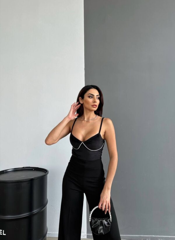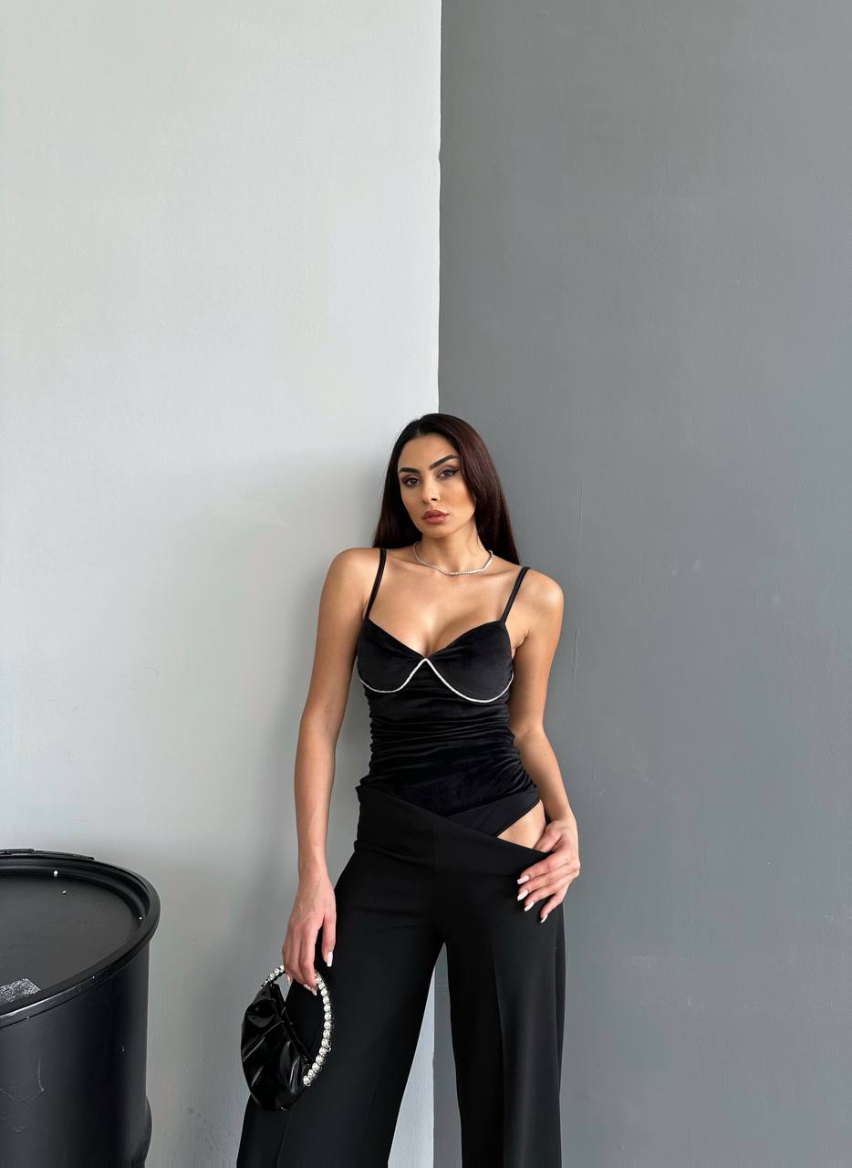 Κορμάκι μαύρο με βαθύ ντεκολτέ και στρας που τραβούν το φως με κάθε κίνηση.