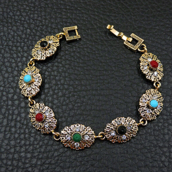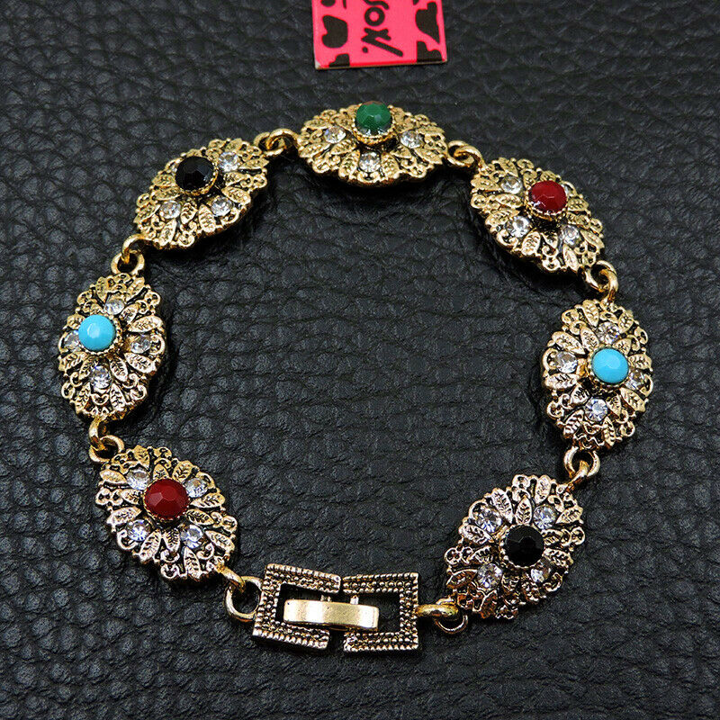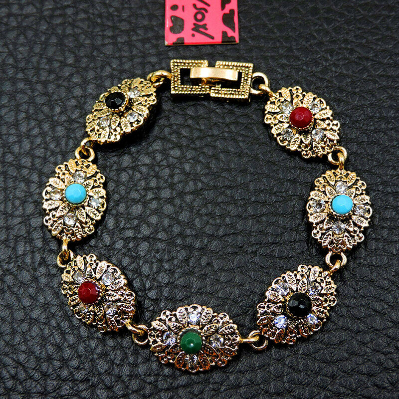Χειροποίητο βραχιόλι, κατασκευασμένο από ασήμι και χαλκό. Διακοσμημένο με πέτρες κόκκινες, πράσινες, τυρκουάζ και μαύρες και λευκά ζιργκόν σε κοπή round. Με επεξεργασία αντικέ. Είναι ευλύγιστο και αγκαλιάζει τον καρπό υπέροχα. Διαθέτει κούμπωμα ασφαλείας