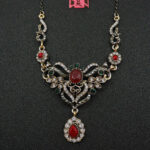 Πολύ ιδιαίτερο κόσμημα, κολιέ κατασκευασμένο από ασήμι και χαλκό με αντικέ επεξεργασία. Μεγάλο μοτίφ 14,5 x 5,5 εκατοστά. Συνοδεύεται από την ανάλογη αλυσίδα 45 εκατοστών 5 εκατοστά το αλυσιδάκι προέκτασης στο πίσω μέρος που καταλήγει σε μία καρδιά με το λογότυπο της γνωστής σχεδιάστριας Betsey Johnson. Διακοσμημένο με ζιργκόν σε κοπή round. Εντυπωσιάζουν με τη λάμψη τους και την καθαρότητα τους τα κόκκινα κρύσταλλα σε κοπή oval & pear.