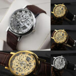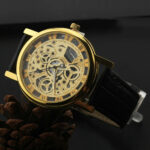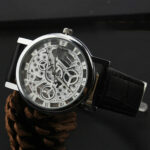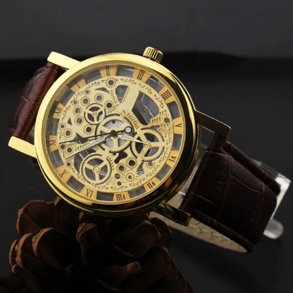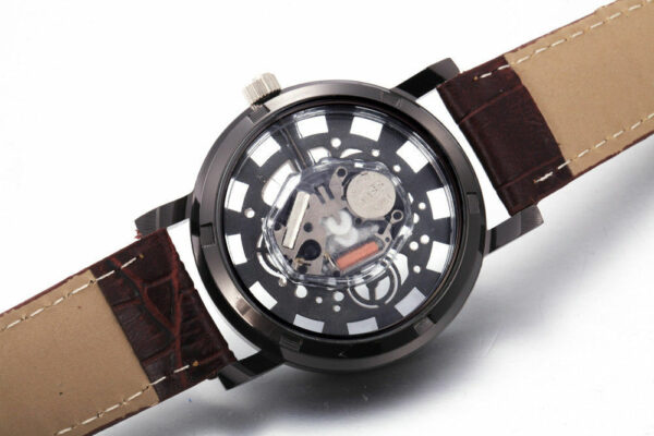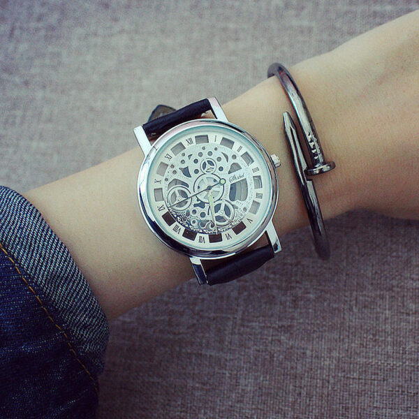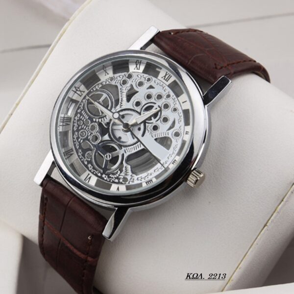 Ρολόι σε πολύ μοντέρνο σχέδιο με διαφανές καντράν και διαφανές το κάτω μέρος του καντράν έτσι ώστε να φαίνεται ο μηχανισμός του. Διαθέτει λουράκι από δερματίνη. Διάμετρος καντράν 4 εκατοστά. Αδιάβροχο έως 3 Atm (πλύσιμο χεριών)