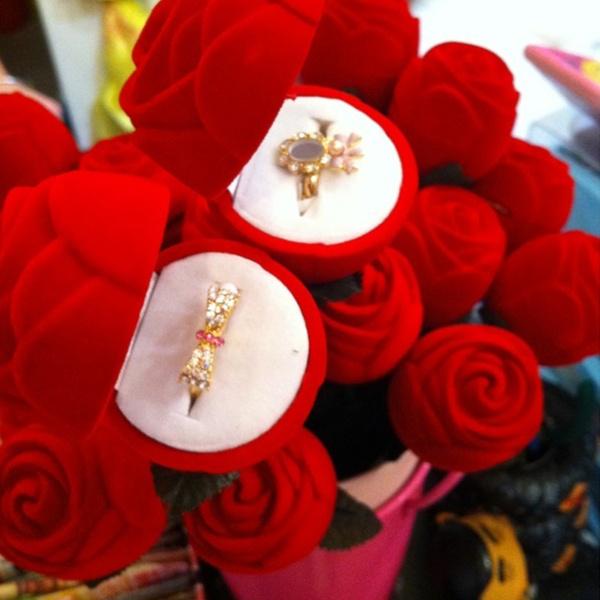 Το κουτί αποτελείται από ένα κόκκινο τριαντάφυλλο με δύο πράσινα φύλλα στο κάτω μέρος. Στο εσωτερικό υπάρχει μια επένδυση με υποδοχές για τη στερέωση του δακτυλίου αρραβώνων.