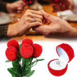 Βελούδινο κουτί για δαχτυλίδι, σκουλαρίκια ή μενταγιόν, σε σχήμα τριαντάφυλλου. Η κορυφή είναι εμφανής. Μέσα στο κουτί υπάρχει μια θήκη κοσμημάτων.