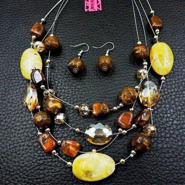 Σετ, διακοσμημένο με καφέ και μπεζ πέτρες, γυάλινες χάντρες, κρυστάλλινες χάντρες διαχωρισμού και γυαλισμένες ασημένιες χάντρες. Αποτελείται από 4 σειρές κολιέ και καφέ σκουλαρίκια.