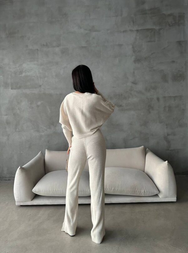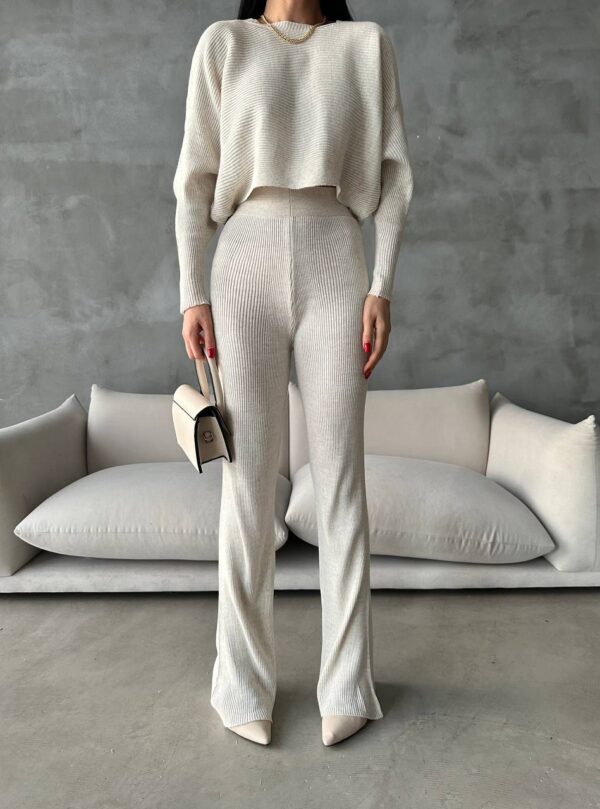 Κοντή μπλούζα με μακριά μανίκια σε μπέζ γήινο χρώμα. Παντελόνα με ψηλή μέση για να δημιουργήσετε ένα στυλάτο two-piece look. Διαθέτει λάστιχο στη μέση για να αγκαλιάζει το σώμα. Μαλακό και ευχάριστο!