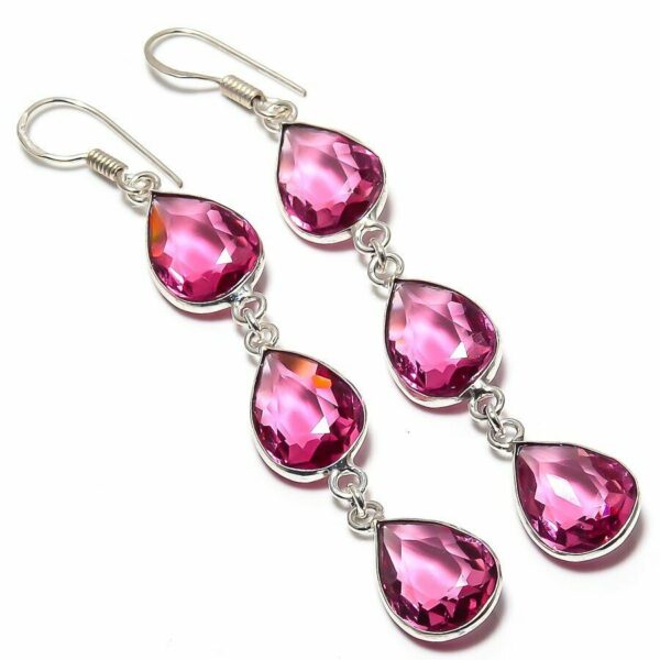 Εντυπωσιακά, χειροποίητα κρεμαστά σκουλαρίκια, κατασκευασμένα από ασήμι 925, διακοσμημένα με Ρουμπιλίτη (Rubillite) σε κοπή pear (Lab creation). Τα σκουλαρίκια έχουν μήκος 7,2 εκατοστά.
