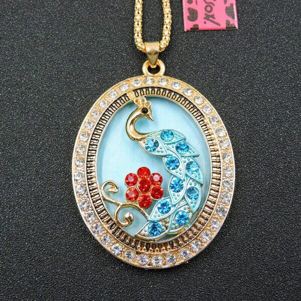 Το τυχερό παγόνι, κατασκευασμένο από ασήμι και χαλκό. Μεγάλο μοτίφ 5.5X4.5 εκατοστά. Συνοδεύεται από την ανάλογη αλυσίδα 70 εκατοστών. Σχεδιασμένο από την Betsey Johnson. Διακοσμημένο με κόκκινα και γαλάζια κρύσταλλα σε κοπή round και λευκά ζιργκόν επίσης σε κοπή round. Φορέστε το χειροποίητο κολιέ και χαρίστε αέρα κομψότητας στην εμφάνισή σας.