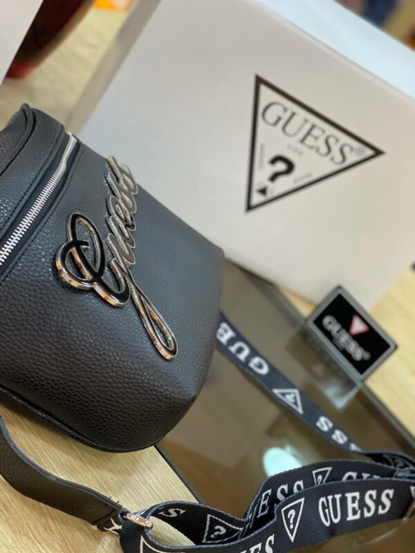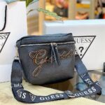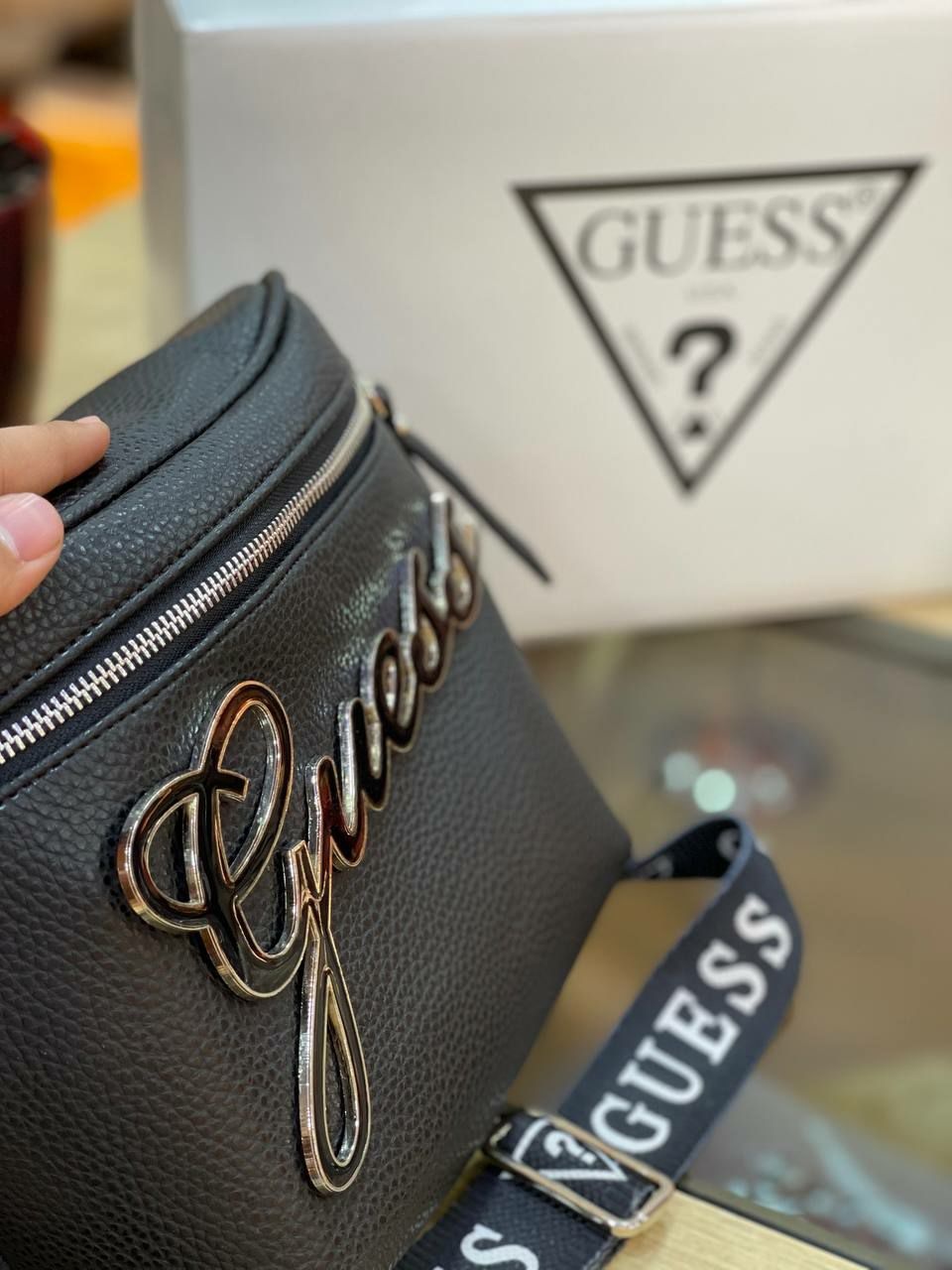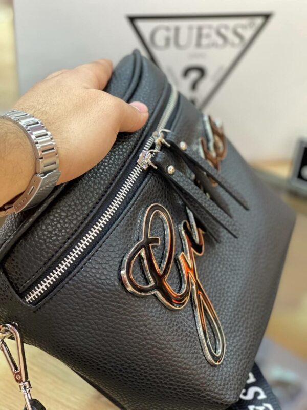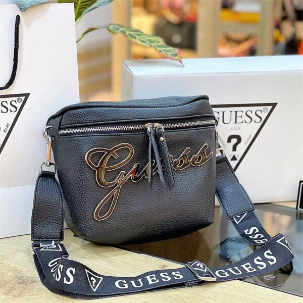 Τσάντα γυναικεία Guess, πολύ μοντέρνα σε χρώμα μαύρο, μεταλλικό  λογότυπο GUESS. Κατασκευασμένη από υψηλής ποιότητας οικολογικό δέρμα. Συνοδεύεται από καταπληκτικό φαρδύ ασπρόμαυρο ιμάντα Guess.