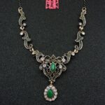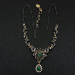 Πολύ ιδιαίτερο κολιέ, κατασκευασμένο από ασήμι και χαλκό με αντικέ επεξεργασία. Μεγάλο μοτίφ 16 x 5 εκατοστά. Συνοδεύεται από την ανάλογη αλυσίδα 45 εκατοστών 5 εκατοστά το αλυσιδάκι προέκτασης στο πίσω μέρος που καταλήγει σε μία καρδιά με το λογότυπο της γνωστής σχεδιάστριας Betsey Johnson. Διακοσμημένο με ζιργκόν σε κοπή round. Εντυπωσιάζουν με τη λάμψη τους και την καθαρότητα τους τα πράσινα κρύσταλλα σε κοπή oval & pear.