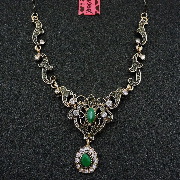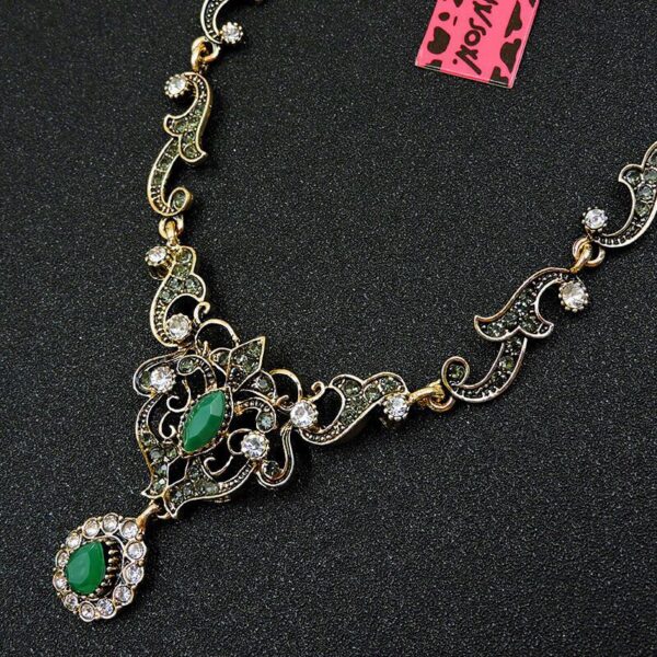 Πολύ ιδιαίτερο κολιέ, κατασκευασμένο από ασήμι και χαλκό με αντικέ επεξεργασία. Μεγάλο μοτίφ 16 x 5 εκατοστά. Συνοδεύεται από την ανάλογη αλυσίδα 45 εκατοστών 5 εκατοστά το αλυσιδάκι προέκτασης στο πίσω μέρος που καταλήγει σε μία καρδιά με το λογότυπο της γνωστής σχεδιάστριας Betsey Johnson. Διακοσμημένο με ζιργκόν σε κοπή round. Εντυπωσιάζουν με τη λάμψη τους και την καθαρότητα τους τα πράσινα κρύσταλλα σε κοπή oval & pear.