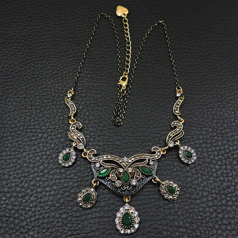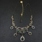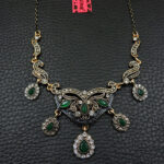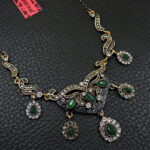 Πολύ ιδιαίτερο κόσμημα, κατασκευασμένο από ασήμι και χαλκό με αντικέ επεξεργασία. Μεγάλο μοτίφ 13 x 4,5 εκατοστά. Συνοδεύεται από την ανάλογη αλυσίδα 45 εκατοστών 5 εκατοστά το αλυσιδάκι προέκτασης στο πίσω μέρος που καταλήγει σε μία καρδιά με το λογότυπο της γνωστής σχεδιάστριας Betsey Johnson. Διακοσμημένο με ζιργκόν σε κοπή round. Εντυπωσιάζουν με τη λάμψη τους και την καθαρότητα τους τα πράσινα κρύσταλλα σε κοπή pear.