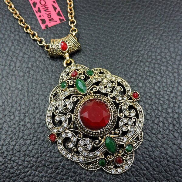 Πολύ ιδιαίτερο κόσμημα, κατασκευασμένο από ασήμι και χαλκό με αντικέ επεξεργασία. Μεγάλο μοτίφ 7×5,5 εκατοστά. Συνοδεύεται από την ανάλογη αλυσίδα μήκους 70 εκατοστών 5 εκατοστά το αλυσιδάκι προέκτασης στο πίσω μέρος που καταλήγει σε μία καρδιά με το λογότυπο της σχεδιάστριας την Betsey Johnson. Διακοσμημένο με ζιργκόν σε κοπή round. Με την κεντρική του πέτρα σε κόκκινο χρώμα σε κοπή round.