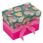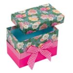 Φλοράλ, ρομαντικό χάρτινο κουτί συσκευασίας δώρου. Διακοσμημένο με φούξια τριαντάφυλλα και φούξια καρό φιόγκο. Διαστάσεων 12,5 X 8 X 9 εκατοστά.