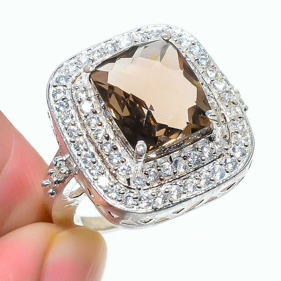Χειροποίητο ινδικό δαχτυλίδι. Kατασκευασμένο από ασήμι 925, διακοσμημένο με ορυκτή πολύτιμη πέτρα καπνιά χαλαζία (Smoky quartz), σε κοπή cushion. Total Carat Weight (TCW): 40. Δύο σειρές λευκά ζαφείρια σε κοπή round! Το δαχτυλίδι είναι διαθέσιμο στο νούμερο 18 & 18,5