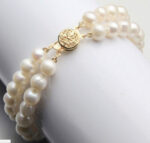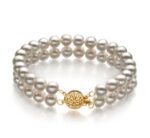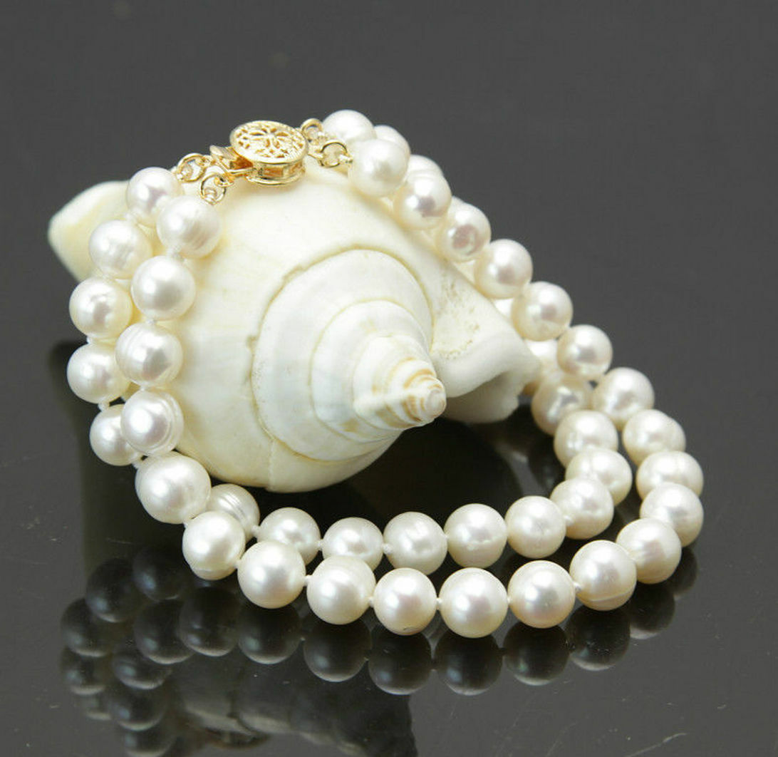 Υπέροχο γυναικείο δίσειρο βραχιόλι με 100% φυσικά λευκά μαργαριτάρια γλυκού νερού 7-8 mm, περασμένα σε διπλό μεταξωτό νήμα, δεμένα κόμπο-κόμπο! Με όμορφο κούμπωμα κατασκευασμένο από ασήμι και επιμετάλλωση από κίτρινο χρυσό 18k!