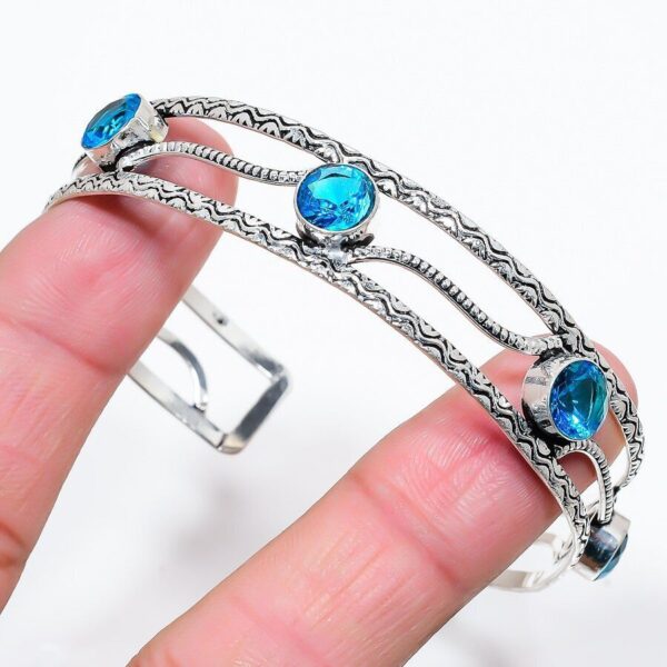 Χειροποίητο, ινδικό βραχιόλι κατασκευασμένο από ασήμι 925. Διακοσμημένο με ημιπολύτιμος ορυκτούς λίθους Swiss Blue Topaz (Ελβετικό Μπλε Τοπάζι) εξαιρετικής καθαρότητας και λάμψης σε κοπή round. Οpen Size για να προσαρμόζεται σε όλους τους καρπούς. Ένα καταπληκτικό ασημένιο βραχιόλι που θα απογειώσει την εμφάνισή σου!!