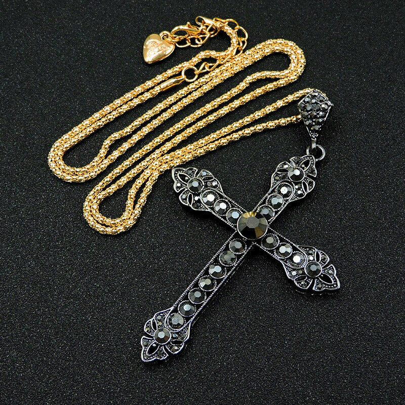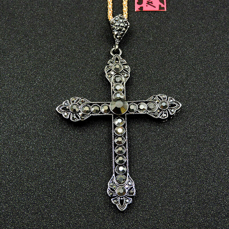 Το αιώνιο σύμβολο του σταυρού, ένα υπέροχο κόσμημα διακοσμημένο με μαύρα αυστραλιανά κρύσταλλα σε κοπή round και επιμετάλλωση με λευκόχρυσο. Κατασκευασμένος από ασήμι και χαλκό. Συνοδεύεται με αλυσίδα 70 εκατοστών, μεγάλο μοτίφ με διαστάσεις 10 εκατοστά X 5,5 εκατοστά .Σχεδιασμένο από την Βetsey Johnson!
