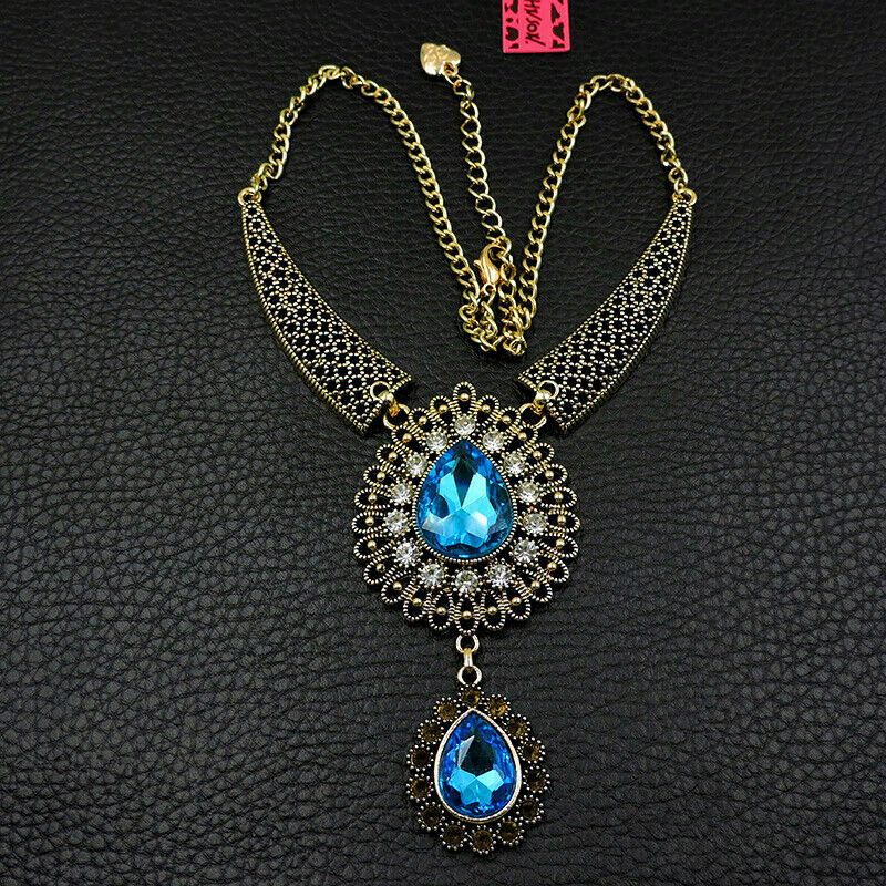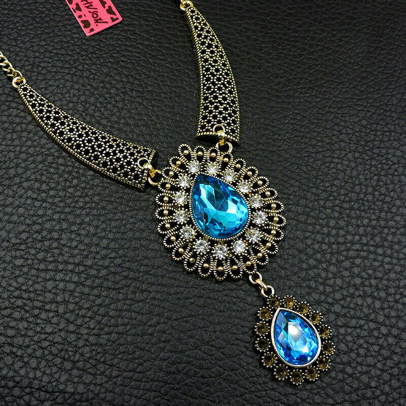 Πολύ ιδιαίτερο κόσμημα, κατασκευασμένο από χαλκό με αντικέ επεξεργασία, μεγάλο μοτίφ 14x5cm. Το κολιέ διαθέτει και αλυσιδάκι προέκτασης 7 εκατοστών στο πίσω μέρος. Φορέστε το χειροποίητο κολιέ με το χρώμα του βαθύ μπλε κρύσταλλο σε κοπή oval και και νιώστε όμορφη και λαμπερή.