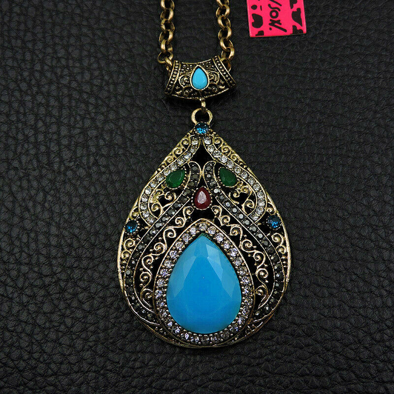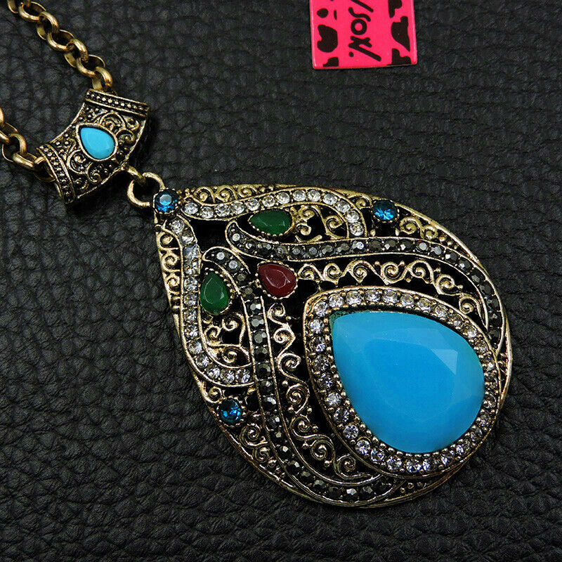 Πολύ ιδιαίτερο κόσμημα, κατασκευασμένο από χαλκό και ασήμι, με αντικέ επεξεργασία, μεγάλο μοτίφ 6×4 cm. Το υπέροχο κρύσταλλο σε τυρκουάζ χρώμα είναι σε κοπή pear. Χαρίστε αέρα κομψότητας στην εμφάνισή σας. Σχεδιασμένο από την Betsey Johnson.