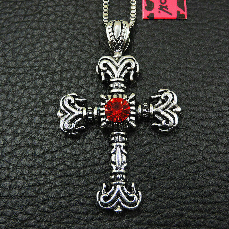 Μενταγιόν με μοτίφ το αιώνιο σύμβολο του σταυρού διακοσμημένο με ένα κατακόκκινο κρύσταλλο σε κοπή round, κατασκευασμένο από ασήμι και χαλκό. Επεξεργασία αντικέ και συνοδεύεται από αλυσίδα μήκους 70 εκατοστών. Είναι σχεδιασμένο από την Betsey Johnson. TΙΜΗ 22 ευρώ. Κωδικός TO315