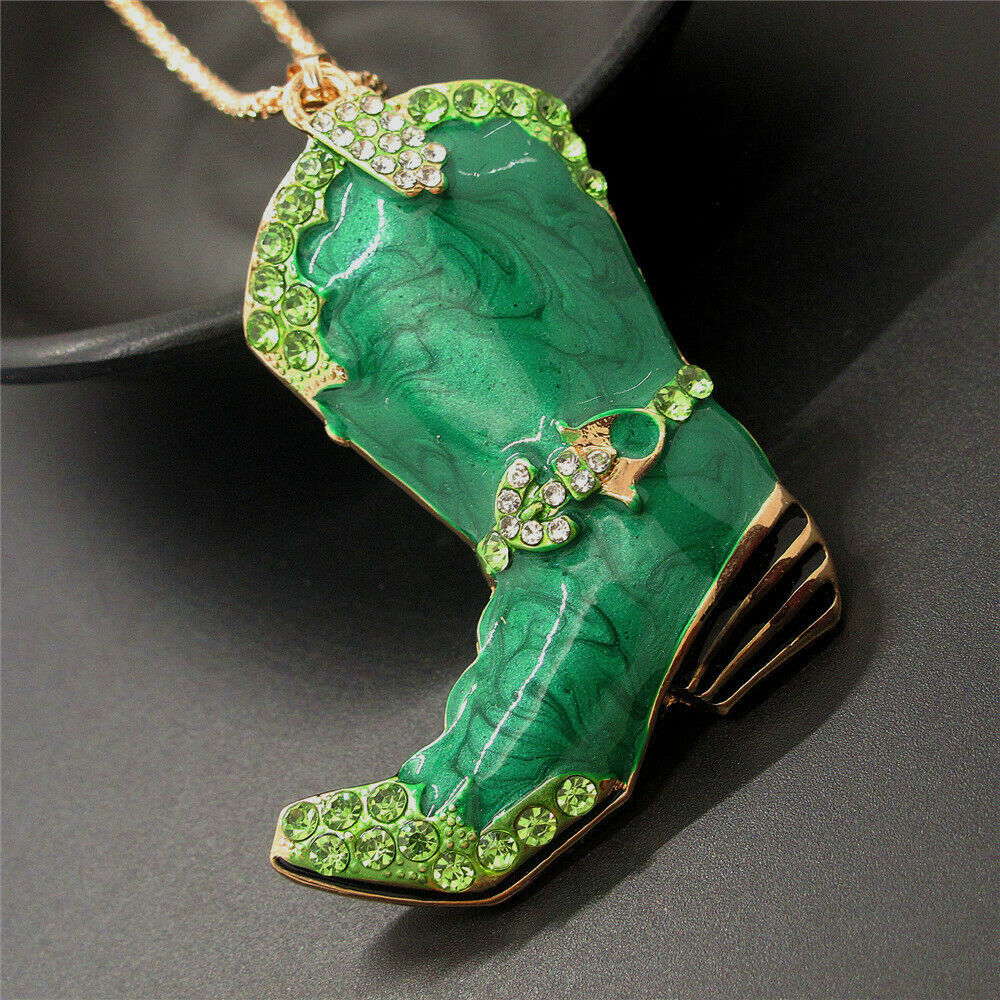 Eντυπωσιακό, μεγάλο μενταγιόν με μοτίφ μία καουμπόική πράσινη μπότα, σχεδιασμένο από την betsey Johnson. Κατασκευασμένο από German Silver. Διακοσμημένο με λαμπερά κρύσταλλα σε κοπή round, με λεπτομέρειες από σμάλτο. Το μενταγιόν συνοδεύεται από χοντρή snake αλυσίδα που καταλήγει σε καρδιά με το λογότυπο της σχεδιάστριας. Μήκος αλυσίδας 70 εκατοστών και διαστάσεις μοτίφ 6,5 χ 6 εκατοστά.