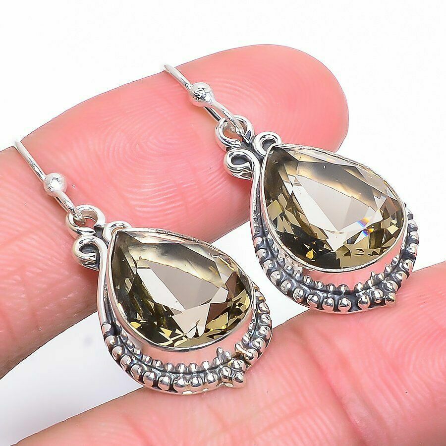 Χειροποίητα, ινδικά σκουλαρίκια κατασκευασμένα από μασίφ ασήμι 925 και διακοσμημένα με υπέροχες πολύτιμες πέτρες, χαλαζία καπνιά ΑΑ ( Smokey Quartz) σε κοπή pear.