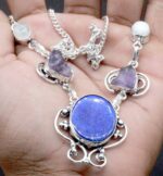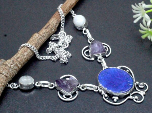 Ινδικό, χειροποίητο μενταγιόν, κατασκευασμένο από ασήμι 925. Διακοσμημένο με πολύτιμους, ορυκτούς λίθους λάπις λάζουλι σε κοπή οβάλ, δύο ακατέργαστους Αμέθυστος και δύο φεγγαρόπετρες σε κοπή οβάλ, δεμένες σε ένα υπέροχο σχέδιο μήκους 45 εκατοστών.