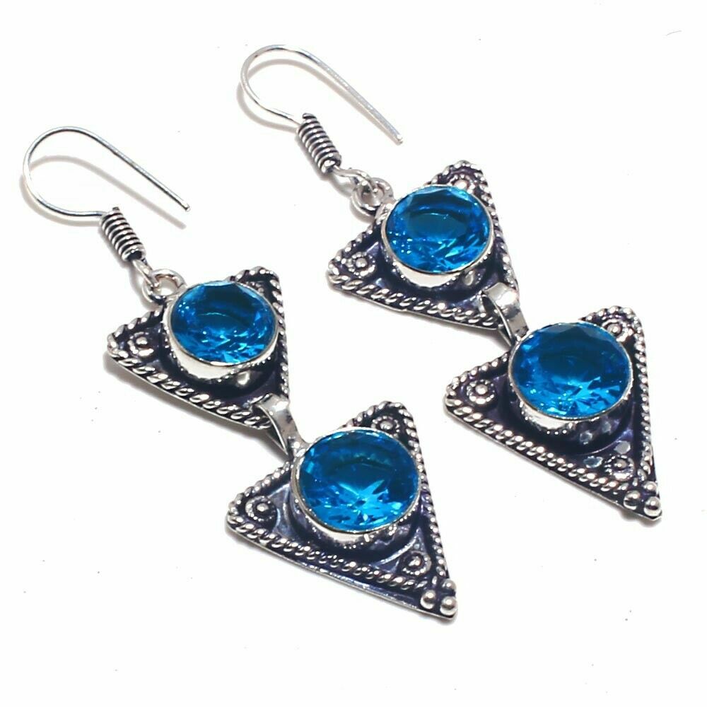 Εντυπωσιακά κρεμαστά σκουλαρίκια, κατασκευασμένα από ασήμι 925, διακοσμημένα με λαμπερά μπλε τοπάζ σε κοπή round.(για να επιτευχθεί η μέγιστη λάμψη).Τα σκουλαρίκια έχουν μήκος 5,6 εκατοστά