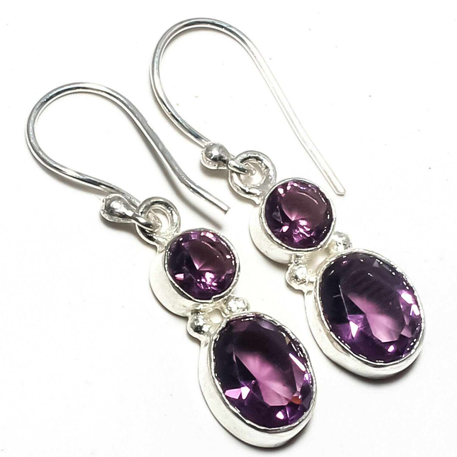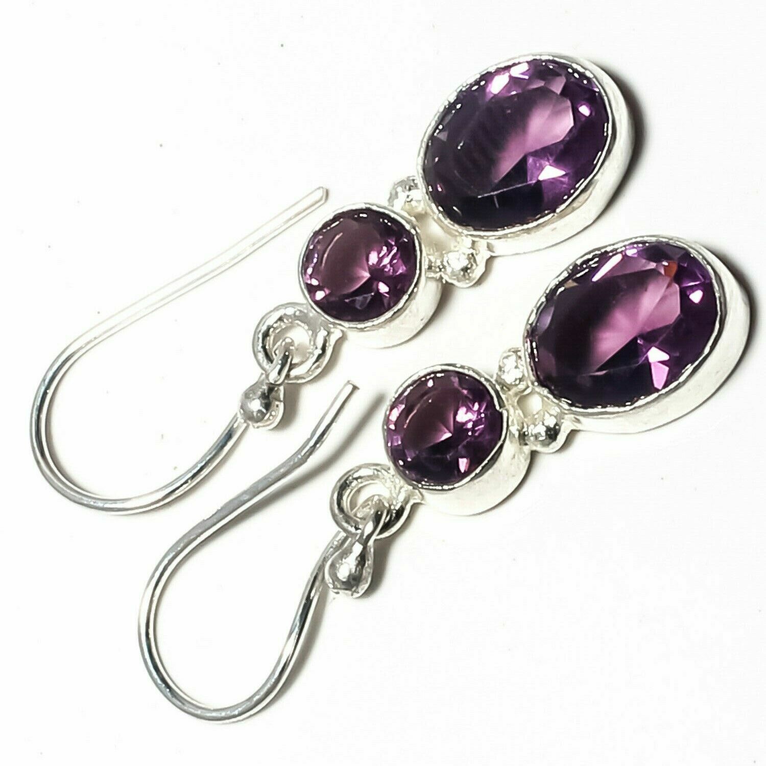 Xειροποίητα σκουλαρίκια κατασκευασμένα από ασήμι 925 διακοσμημένα με φυσικούς, ορυκτούς, πολύτιμος Αμέθυστος σε κοπή οβάλ και round. Tα σκουλαρίκια έχουν μήκος 3,5 εκατοστά