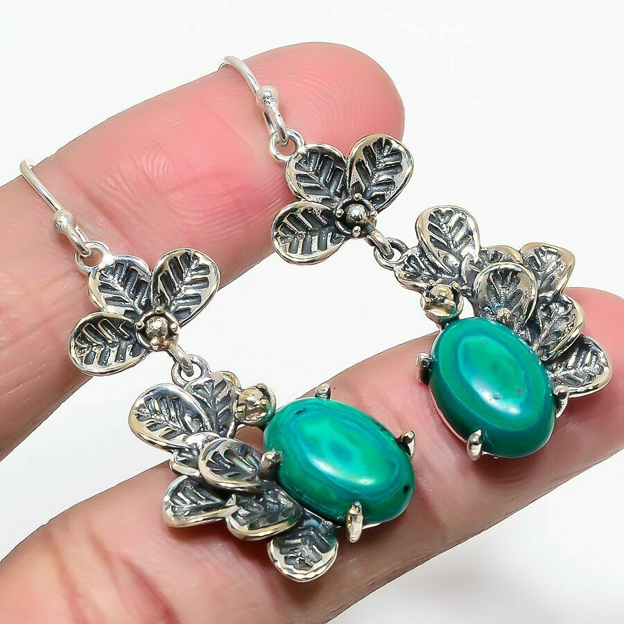 Χειροποίητα σκουλαρίκια κατασκευασμένα από ασήμι 925 διακοσμημένα με δύο υπέροχες, ορυκτές, πολύτιμες πέτρες Mαλαχίτη! Tα σκουλαρίκια έχουν μήκος 5,3 εκατοστά.