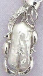 Ασημένιο μενταγιόν 925, διακοσμημένο με 100% μπαρόκ ΦΥΣΙΚΗ shell πέρλα (mother of pearl) γλυκού νερού 19mm και τρία (3) λευκά ζαφείρια (lab creation) σε κοπή round! Το μενταγιόν συνοδεύεται από την ασημένια αλυσίδα του μήκους 45cm.