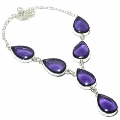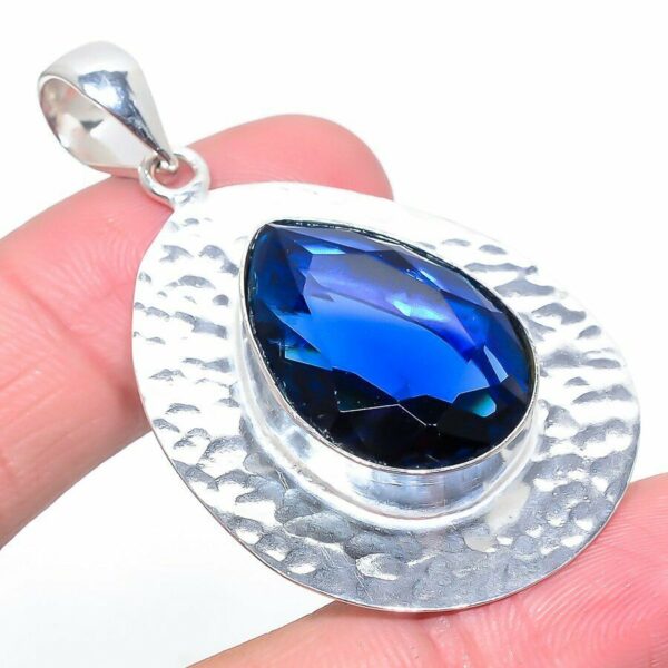 Χειροποίητο μενταγιόν, κατασκευασμένα από ασήμι 925 και διακοσμημένο με Lab creation πέτρα Ιολίτη (Iolite) σε κοπή pear. Total Carat Weight (TCW): 52. Mήκος 6,2 cm.